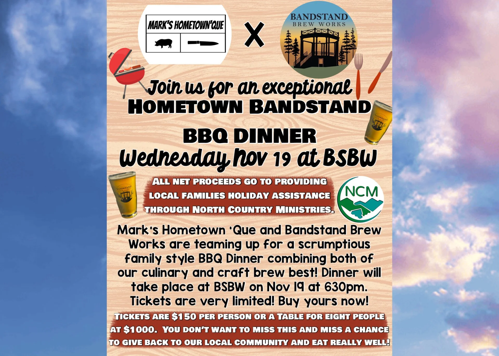 Hometown Bandstand BBQ Dinner to Benefit Local FamiliesMark's Hometown 'Que X Bandstand Brew Works. Join us for an exceptional Hometown Bandstand BBQ Dinner on Wednesday November 19, at 630pm at Bandstand Brew Works in Warrensburg, NY. Mark's Hometown 'Que and Bandstand Brew Works are teaming up for a scrumptious family style BBQ dinner combining both of our culinary and craft brew best! All net proceeds will go to providing local families holiday assistance through North Country Ministries. Tickets are very limited! Buy yours now! Tickets include your meal of appetizers, entrees, sides, and dessert, along with two drinks. Tickets are $150 per person or purchase a table of 8 seats for $1000. You don't want to miss a chance to give back to our local community and enjoy a really delicious collab meal from Mark's Hometown 'Que and Bandstand Brew Works, Where Community Gathers!