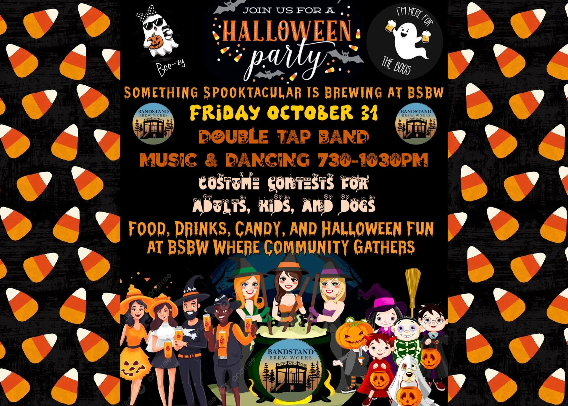 BSBW's 2nd Annual Spooktacular Halloween Partyππ» Something SPOOKTACULAR is brewing at Bandstand Brew Works! π»π Join us Friday, October 31 for a night of music, dancing, and wicked good fun! πΊπ Double Tap Band hits the stage from 7:30β10:30 PM β come ready to dance! πΊπ¬ Costume contests for adults, kids, and even dogs! Bring your crew for food, drinks, candy, and Halloween magic at the place where community gathers. β¨ Donβt ghost us β see you at BSBW for a frightfully good time! π§ββοΈπΈοΈ