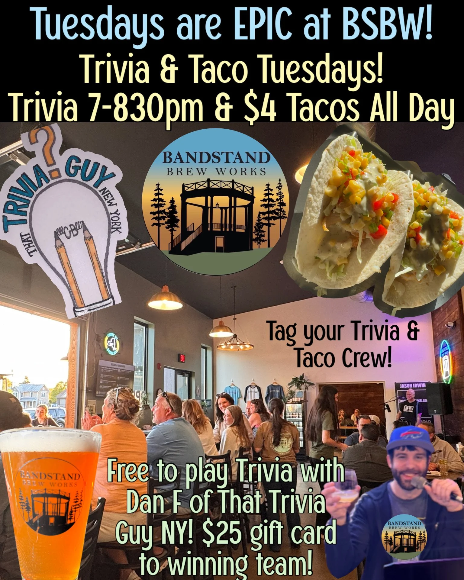 TUESDAYS!Trivia Tuesdays 7:00 PM-8:30 PM With Dan F from That Trivia Guy NY Gather some brainy buddies and brew up some fun at our trivia night! FREE to play, tons of fun, $25 gift card to the winning team! Taco Tuesday ALL DAY $4 Tacos all day! Mix and match all you like! Enjoy a specialty taco menu only available on Tuesdays for dine in! Community Tuesdays ALL DAY If you live or work in Warrensburg, enjoy $1 off a bee and $1 off an app! Buy and entree and get 50% off your app no matter where you are seated in the brewery!